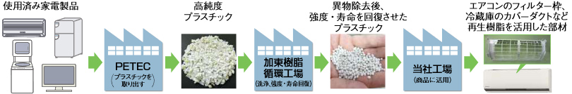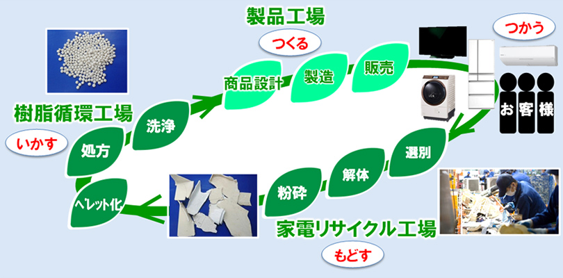 2001年の「家電リサイクル法」施行以前、多くの家電は埋め立て処分されていました。現在は家電リサイクル法対象製品について、そのほとんどが回収され、リサイクル処理されています。当社では「商品から商品へ」をコンセプトに、使い終わった商品から取り出した資源を活用する取り組みの拡大を進めています。樹脂では、使用済み家電製品(洗濯機・冷蔵庫・エアコン・テレビ)から取り出した樹脂の自社製品への再利用を進めています。