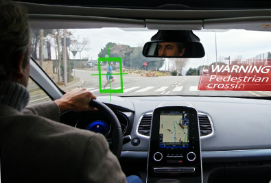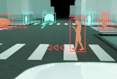 「認知」「判断」では、より高度なセンシング技術の研究・開発として、深層学習(ディープラーニング)を活用した画像からの人物・車両を検出する技術開発にも取り組んでいます。交差点など、人物・車両が混在する環境であっても、精度よく、高速に検出できるようになります。