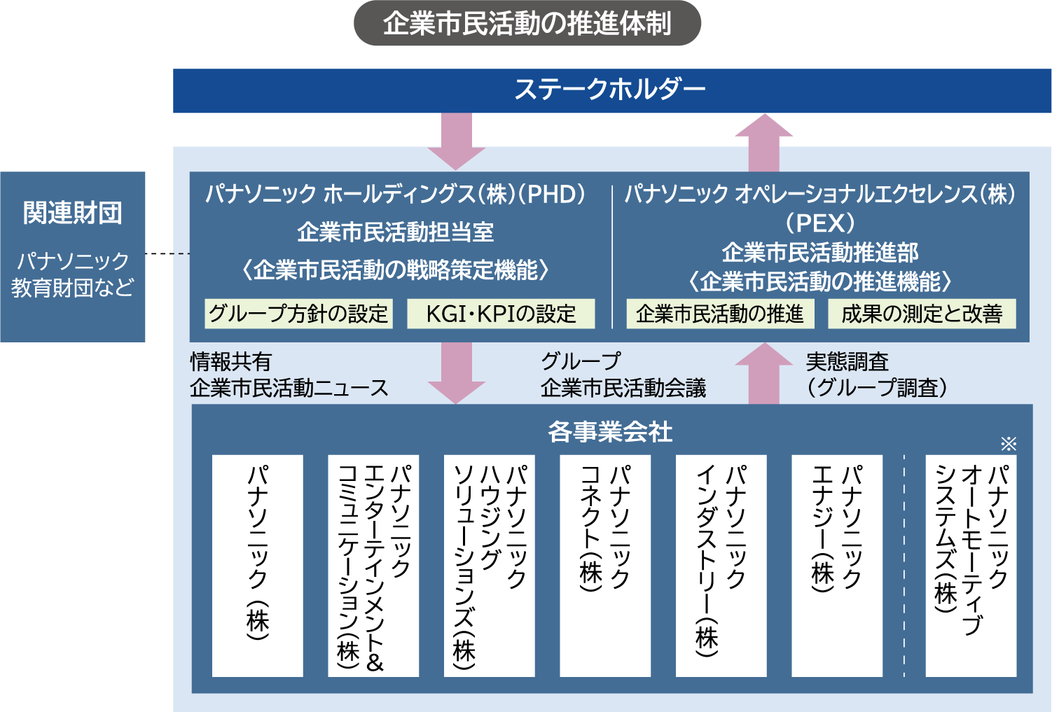 企業市民活動は、グループCEOが直接管掌し担当します(2025年8月現在)。パナソニック ホールディングス(株)(以下、PHD)企業市民活動担当室がグループ全体の戦略策定機能を担当し、パナソニック オペレーショナルエクセレンス(株)(以下、PEX)企業市民活動推進部、事業会社などとともに活動を推進しています。各事業会社には企業市民活動担当者を設置し、各社・各地域の実態に合わせた活動を展開しています。それらの活動については「企業市民活動ニュース」にてグループCEO以下、関連する取締役・役員、世界各地域の企業市民活動担当者に共有しています。