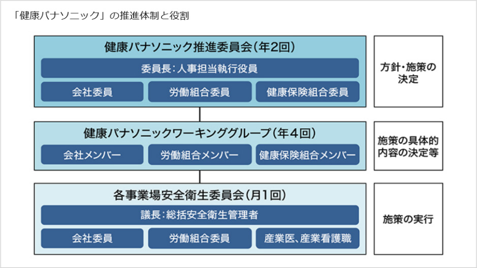 2001年から取り組みをスタートした「健康パナソニック活動」の方針・施策の決定機関として、「健康パナソニック推進委員会」を設置し、その傘下の「健康パナソニックワーキンググループ」で施策の具体的な内容を決定し、各事業会社・事業場の安全衛生委員会で施策を実行しています。
