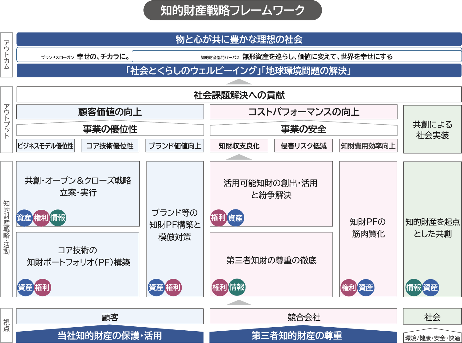 当社グループは、事業活動において社会課題の解決に貢献することを目指しています。社会課題に正面から向き合ってその解決に貢献し、結果として事業を成長させることに加えて、知的財産活動においても、多様なヒト・モノ・コトがつながり、協力しあう仕組みを構築し、個社では対応困難な社会課題を、無形資産を起点とした共創関係の構築により解決すべく、新たな知的財産戦略を推進しています。
