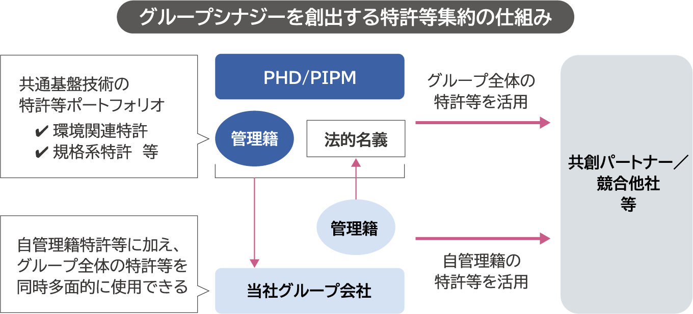 当社グループでは、PHDに特許等を集約して当社グループ全体の資産として同時多面的に使用し、活用する仕組みを設けています。PHDおよびその子会社であるPIPMは、当社グループ全体の特許等(例:共通基盤技術に関する特許、当社グループ会社から法的名義を集約した特許)を対外的に活用します(例:ライセンス)。そして、この仕組みの対象となる当社グループ会社(国内)は、みずから生み出しまたは譲り受けた特許等を、PHDへの法的名義集約後も管理し(「管理籍」の保持)、当該特許等の費用を負担し、当該特許等に基づく収益を受け取ります。そして、当該グループ会社は、みずからが管理籍を有する特許等を対外的に活用するとともに、当社グループ全体の特許等を使用できることになります。当社グループでは、この仕組みにより、社内外の共創等を促進しています(下図)。