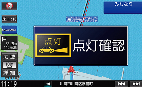 このカーナビには、初めての道を走る時にも安心な“安心運転サポート機能”がついています(写真5)。これは、走行している道路の制限速度をはじめ、一時停止やカーブ、踏切など注意が必要な場所を表示と音声で、分かりやすく案内する機能です。地図表示だけでなく、周囲が暗くなってもヘッドライトが点灯しない場合に注意を促すなど、さまざまな状況でドライバーをサポートしてくれるんですよ。