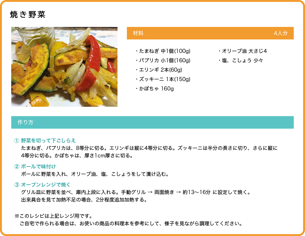 カレーの材料を煮込んでいる間に、オーブンレンジで「焼き野菜」をつくります。オーブンレンジの操作に慣れていない方にとっては少し緊張する場面ですが、切った野菜を並べたグリル皿に塩とオリーブオイルをまわしかけ、オーブンレンジに入れてグリルモードにセットしさえすれば、後は機械におまかせで、手軽にヘルシーな焼き野菜が完成。色鮮やかな野菜をカレーにトッピングすることで、ごくオーソドックスなカレーがパッと華やかになるところも、とてもウケていました。