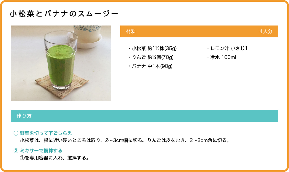 ミキサーを使って「小松菜とバナナのスムージー」もつくりました。機械を扱うのに慣れている男性は、女性よりも、初めてのミキサーも上手に使いこなしていました。